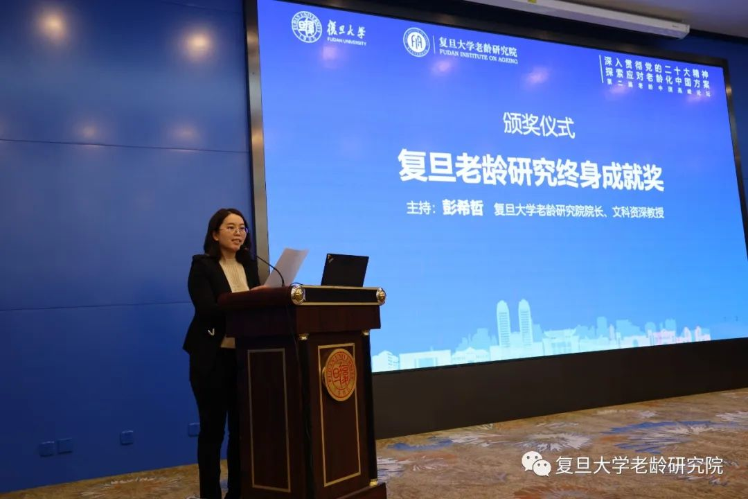 颁奖典礼由复旦大学文科资深教授、老龄研究院院长彭希哲主持。据悉,“复旦老龄研究终身成就奖”由复旦大学老龄研究院颁发,致敬毕生投身于老龄科研、作出重大贡献的专家学者。邬沧萍教授是首位获得该奖项的学者。