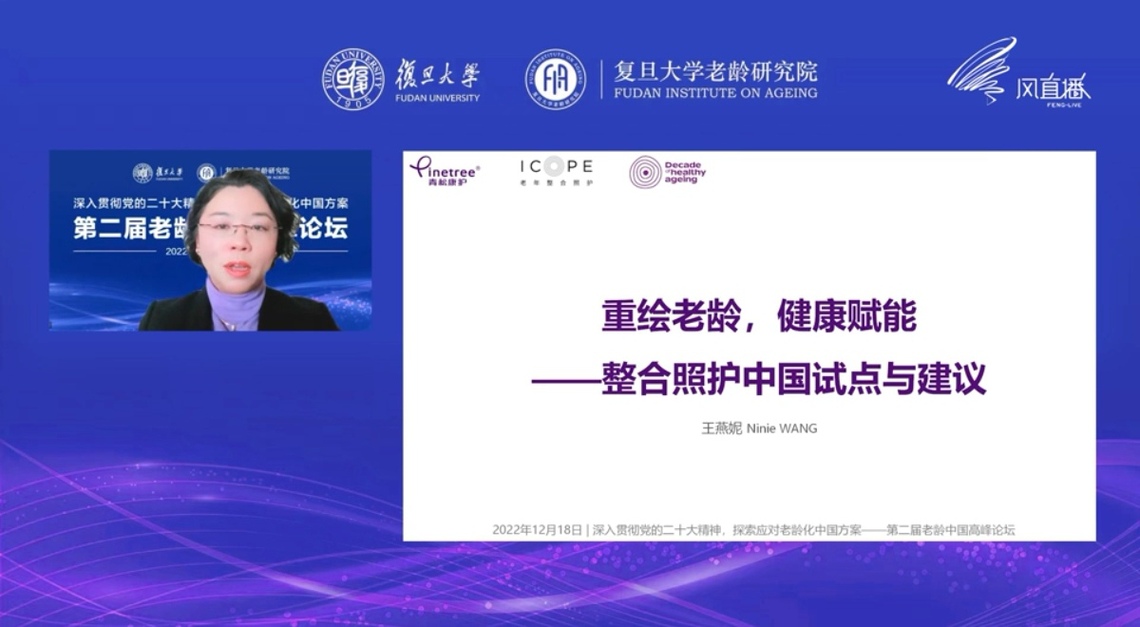 青松康复护理集团创始人王燕妮发表了题为《重绘老龄,健康赋能——整合照护中国试点与建议》的演讲。由健康老龄化新旧模式在干预时机、价值理念、资本投入、支付方式四个层面的选择问题开篇。介绍了世界卫生组织老年整合照护(ICOPE)试点在中国的最新进展状况,从识别、评估到干预与管理的“三步走”整合照护基本路径出发,总结第一阶段可行性试点工作的经验,推进接下来全国多中心试点的进展。基于前期的初步试点,她提供了对整合照护中国方案的四大建议:一整合支付资源;二设立协调整合机构;三发展全科、整合型人才队伍;四各方共照共管的健康档案。以此为鉴,发挥健康赋能作用,重绘老龄社会前景,携手助力中国健康老龄化。