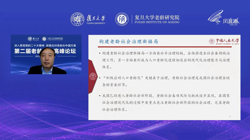 中国人民大学副校长、老年学研究所所长杜鹏教授的发言主题是《中国式现代化与积极应对人口老龄化》。发言从人口新格局与积极应对人口老龄化、以实现享有基本养老服务促进高质量发展、以社会治理新格局回应时代需求三个方面展开。他提到“人口规模巨大的现代化”是中国式现代化的首要特征,人口老龄化的趋势和特点将会深刻影响中国的经济社会生活的各个领域,进而影响到中国式现代化整个进程。因此有必要立足于高质量发展要求,进一步提升基本养老服务质量:一是了解基本养老服务需求量,二是全面加强组织保障和人才支持,三是创新基本养老服务形式与内容,四是加强基层党组织建设,推动养老服务下沉。党的二十大报告强调“完善社会治理体系”,推进健康中国建设、积极应对人口老龄化关键在于治理,重点包括构建老龄社会治理新格局,建立老龄社会治理新机制以及深化老龄社会治理新模式,推动老龄社会治理从老龄友好向全龄友好转变。