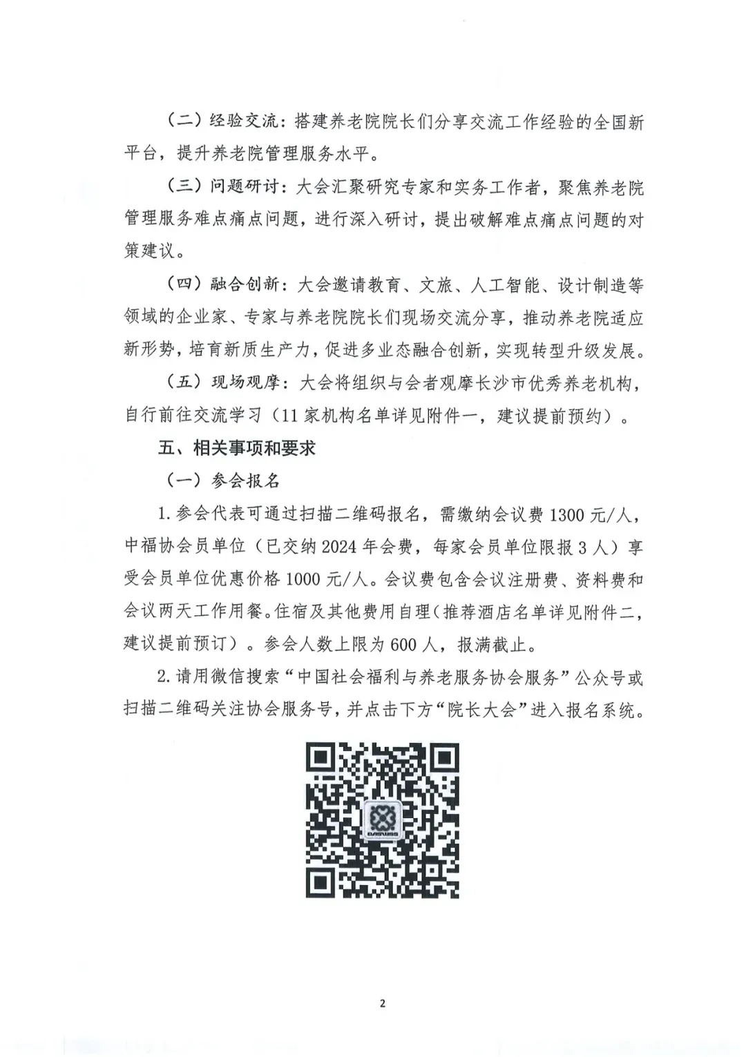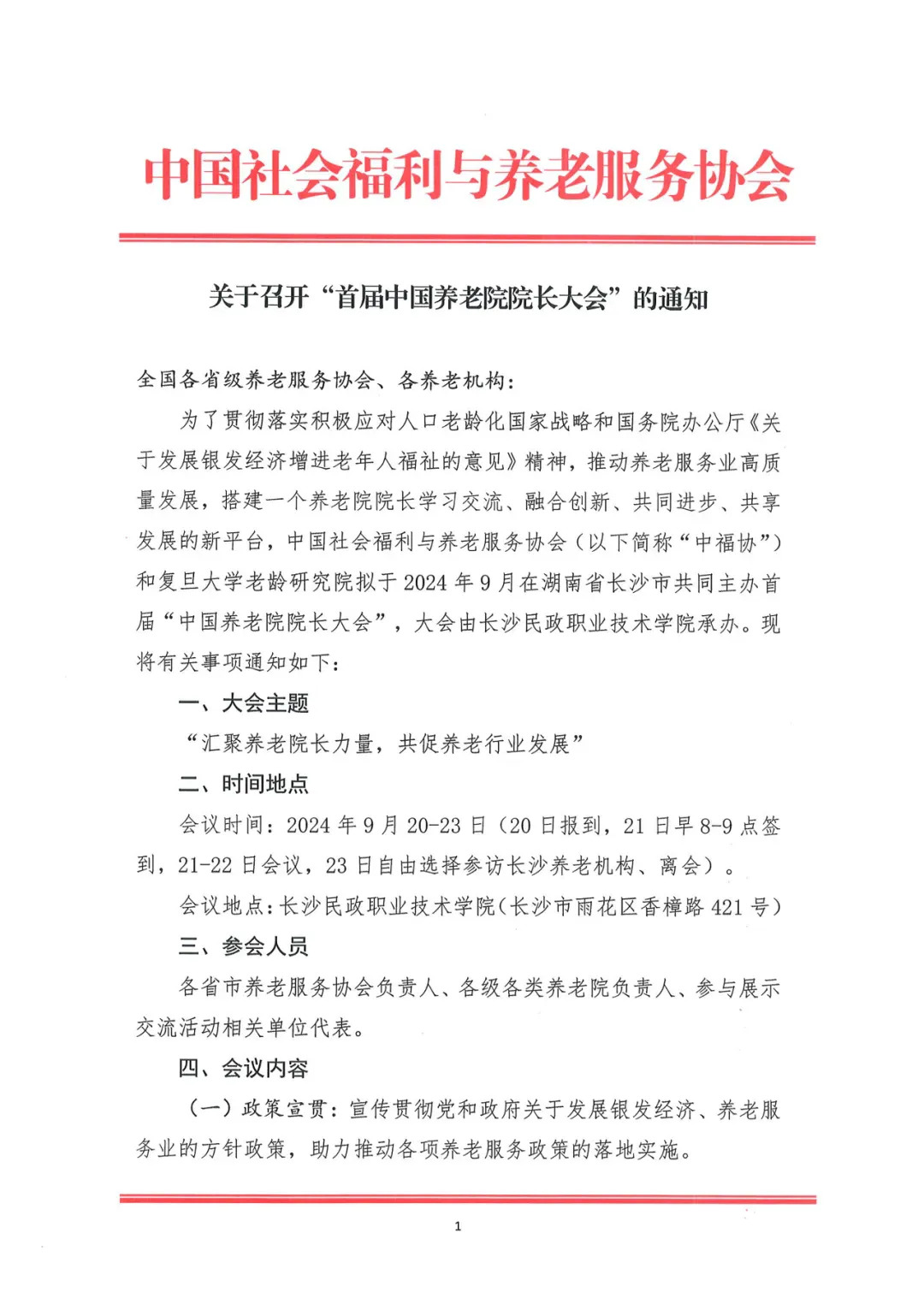 为了贯彻落实积极应对人口老龄化国家战略和国务院办公厅《关于发展银发经济增进老年人福祉的意见》精神,推动养老服务业高质量发展,搭建一个养老院院长学习交流、融合创新、共同进步、共享发展的新平台,中国社会福利与养老服务协会(以下简称“中福协”)和复旦大学老龄研究院拟于2024年9月在湖南省长沙市共同主办首届“中国养老院院长大会”,大会由长沙民政职业技术学院承办。现将有关事项通知如下: