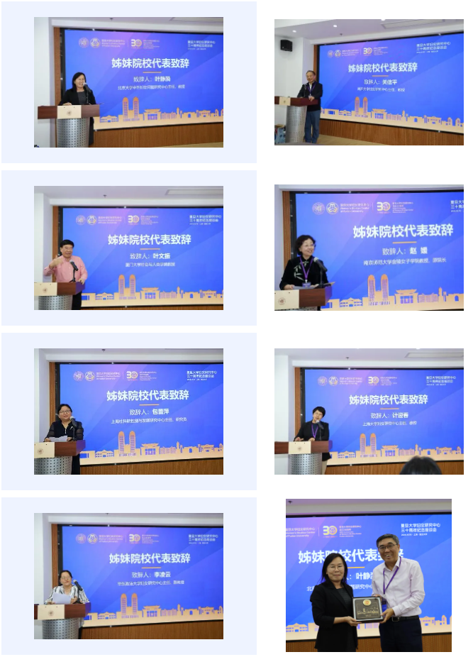 接下来,来自7所姊妹院校的代表先后致辞。北京大学中外妇女问题研究中心主任叶静漪教授强调妇女事业是党和人民事业的重要组成部分,妇女研究事业的发展和妇女中心的建设,始终与国家现实关切紧密联系,与妇女事业发展紧密结合。她表示北京大学期待与复旦大学及其他机构建立更紧密的合作机制,为性别平等事业贡献力量。南开大学妇女研究中心主任关信平教授指出在中国式现代化的新征程上,妇女事业也需实现高质量发展,尤其需要解决现今人口趋势下女性职场与家庭角色矛盾的新挑战。他表示南开大学妇女与发展研究中心希望与复旦大学妇女研究中心加强交流与合作,探讨新议题。厦门大学社会与人类学院叶文振教授指出,复旦妇女研究中心在“四个融合”方面特点突出:多学科的双向互动、聚焦上海发展将研究成果转化为有效的政策建议、与妇联的工作紧密结合、动员多方力量参与并强化信念融合。他表示,厦门大学期待深化合作,携手为广大妇女开展学术研究。南京师范大学金陵女子学院原院长赵媛教授对复旦大学在妇女研究领域的贡献表示肯定,表示今后进一步加强跨学科深度合作,在构建中国妇女性别研究自主知识体系的过程当中贡献智慧和力量。上海社科院性别与发展研究中心主任包蕾萍教授指出复旦大学的妇女研究中具有大局观,在学科建设、人才培养、国际交流等方面具有榜样力量,未来将与各姐妹单位携手推进全社会对性别平等和妇女发展的关注。上海大学妇女研究中心主任计迎春教授向复旦大学妇女研究中心成立30周年表示祝贺。她提出妇女研究是要致力于在公私领域实现两性的机会、权力、义务和责任的平等,建议姐妹院校加强关于性别研究和妇女研究的合作,建立学术共同体。华东政法大学妇女研究中心主任李凌云副教授呼吁各位专家学者继续在维护妇女合法权益上夯实理论、关注实践热点,与各姐妹单位加强合作为学术发展、政策落地提供重要的平台和支撑。