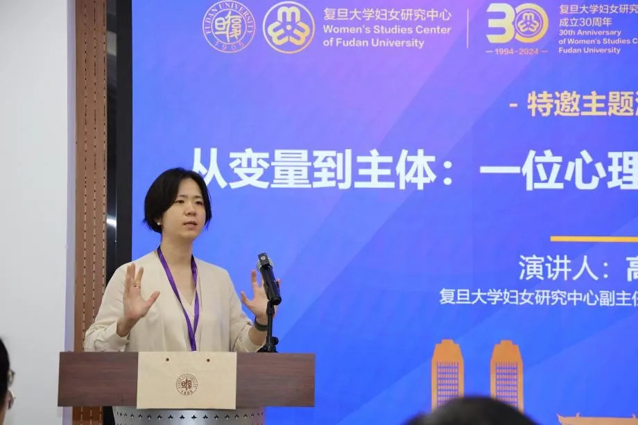 复旦大学妇女研究中心副主任、心理学系副主任高隽教授以“从变量到主体:一位心理学人的性别研究尝试”为题做演讲。她从羞耻易感性引入性别差异话题,先后介绍了参与和推进的长三角地区社会变迁调查(FYRST)、“性骚扰”与“性教育”系列研究、性客体化系列研究。她在过去十年的性别研究中从将性别作为控制变量到将性别特定经验视为主要审视的对象;而她作为研究者,从性别中立的主体转向有性别的主体。
