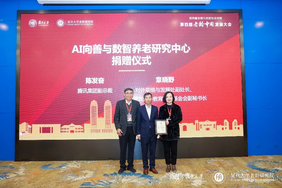 在开幕式上,腾讯集团副总裁陈发奋代表腾讯集团向复旦大学教育发展基金会捐款,用以建立老龄研究院AI向善与数智养老研究中心和相关研究项目,首期捐款350万人民币。复旦大学对外联络与发展处副处长、上海复旦大学教育发展基金会副秘书长章晓野向陈发奋先生授予捐赠奖牌。