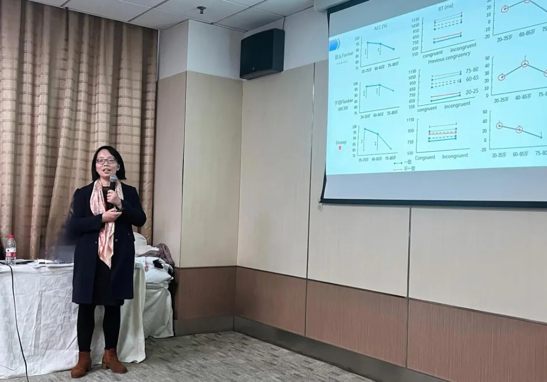 江西师范大学心理学院曹碧华副教授汇报的题目为“冲突加工进程中认知控制的老化研究”。她从加工速度假说和额叶老化假说出发,提出两大核心问题:一是随着年龄增长,老年人的抑制控制能力是增强还是减弱?二是老年人的冲突适应能力是否有所变化?她强调,冲突加工进程可以作为观察老化起始点变化的重要窗口,研究其对认知控制的影响尤为关键。她指出,未来研究需引入连续年龄变量,更精细地刻画老化过程中的动态变化,这将有助于理解不同年龄阶段的认知控制特征,并为制定个性化、精准化的干预策略提供科学依据。