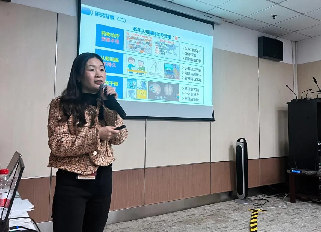 贵州中医药大学应用心理学专业任艳娜教授做了题为“基于跨通道知觉训练的老年人认知促进及其神经机制”的汇报。她基于当前老年认知障碍干预方法存在的问题,将多感觉信息整合作为应对这一问题的“新突破口”。围绕视听整合的老化机制、适应性补偿机制以及跨通道知觉训练对认知水平的提升展开研究。研究表明:第一多感觉信息补偿效应主要通过提高传统视听觉整合脑区的整合能力、激活新的脑区参与视听觉整合、提高大脑整体的功能连接实现;第二,跨通道知觉训练可以有效提高老年人的知觉敏感性、视听整合效应、脑功能连接强度,但存在很大的群体异质性。第三,知觉训练可以有效提高被试的注意力和记忆力。其团队还基于前期研究成果进行了计算机辅助认知干预系统的应用研究,为老年认知健康提供了新思路。