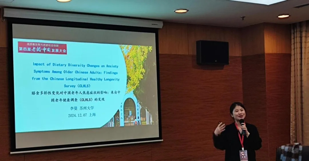 苏州大学社会学院李曼副教授以“饮食多样性变化对中国老年人焦虑的影响:来自中国老年健康跟踪调查(CLHLS)的证据”为题作报告。她使用了中国老年健康跟踪调查2018和2022两期数据,研究饮食多样性变化对老年人焦虑的影响,发现维持高水平的饮食多样性能够显著降低老年人焦虑风险,饮食多样性降低或持续保持低水平饮食多样性的老年人焦虑风险更高等研究结论。