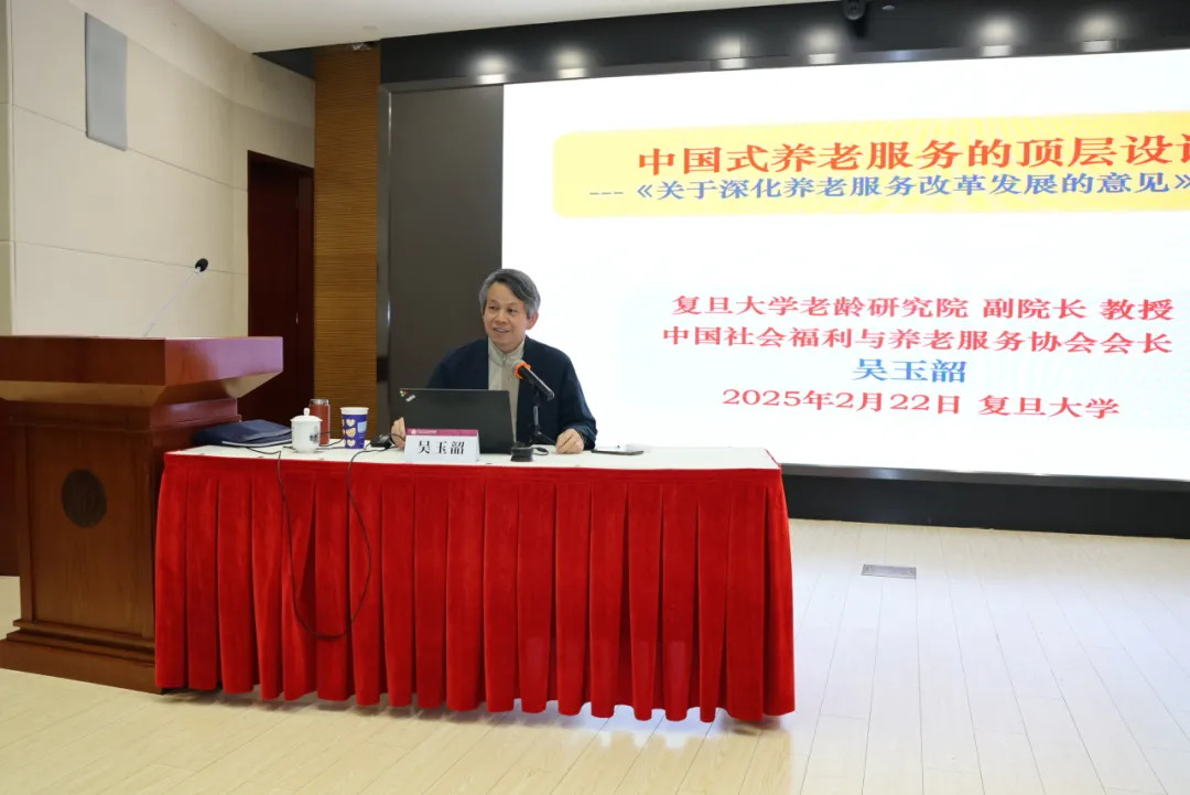 2025年2月22日,在第二期复旦大学“问道”养老领军人才研修班第三次集中面授培训班上,复旦大学老龄研究院副院长、中国社会福利与养老服务协会会长吴玉韶教授为学员们授课,课程题目为“中国式养老服务的顶层设计——《中共中央国务院关于深化养老服务改革发展的意见》解读”。“问道”班第二期学员、第一期20余位学员参训。
