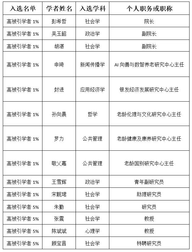 其中,彭希哲教授、吴玉韶教授、胡湛教授、申琦教授、封进教授、孙向晨教授、罗力教授、敬乂嘉教授、王雪辉青年副研究员、宋靓珺助理研究员分别入选社会学学科、公共管理、哲学、新闻传播学和政治学学科“2024中国知网高被引学者Top 1%”;朱勤研究员、张震教授、陈斌斌教授、外聘专家顾宝昌教授分别入选社会学学科“2024中国知网高被引学者Top 5%”。
