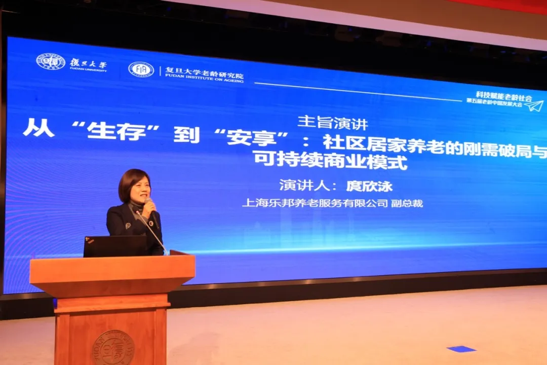 上海乐邦养老服务有限公司副总裁庹欣泳发表的演讲主题为《从“生存”到“安享”:社区居家养老的刚需破局与可持续商业模式》。她介绍了上海恒研乐邦聚焦社区居家养老“最后一公里”的落实情况,提出社区居家四级人才梯队:站长统筹、顾问评估、管家调度、护理员执行,以“无评估不服务”精准匹配需求,通过持证培训+薪酬激励打造职业化队伍,融合居家-社区-机构“三位一体”, 构建以“养老管家”为核心的虚拟养老院模式,助力老年人从“活着”迈向“安享”的幸福生活。