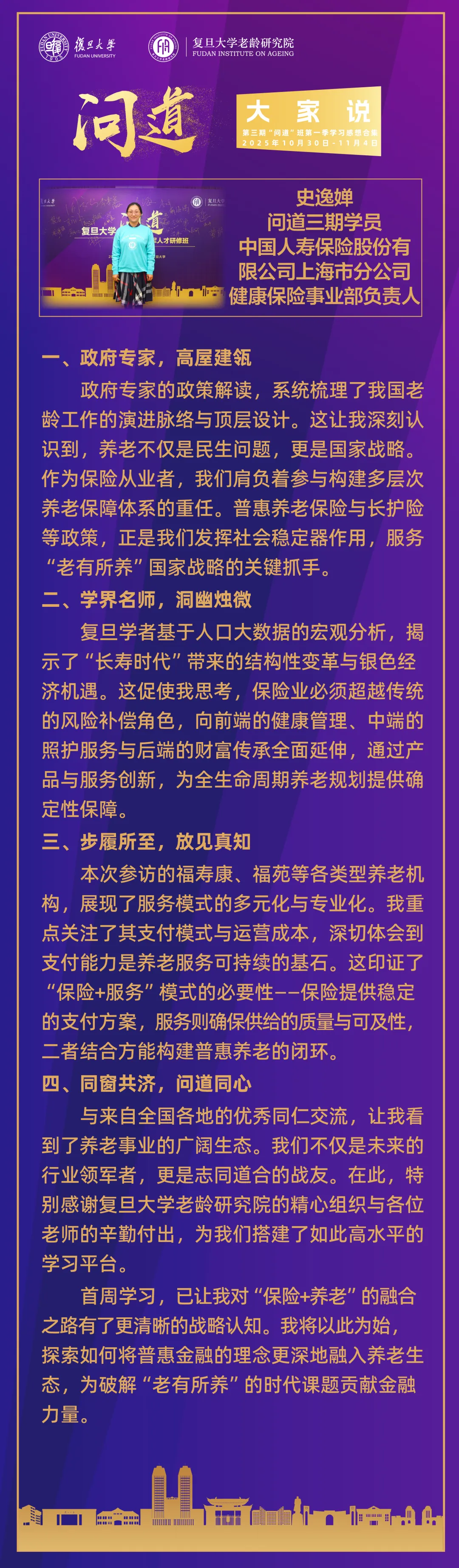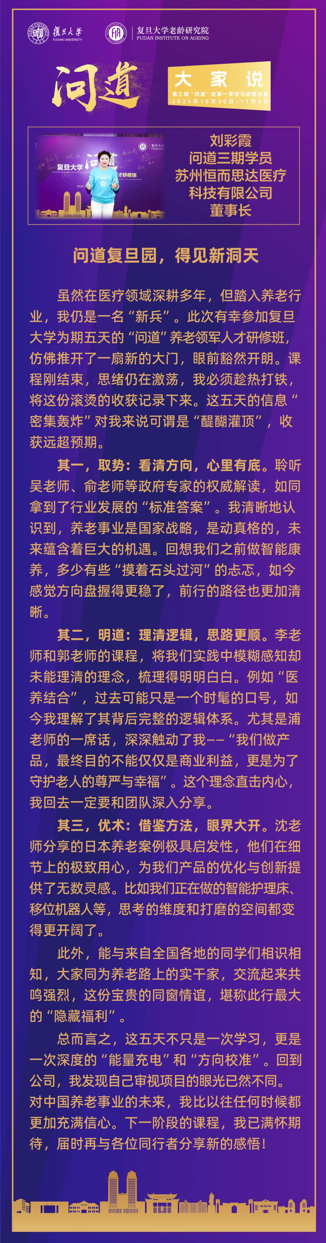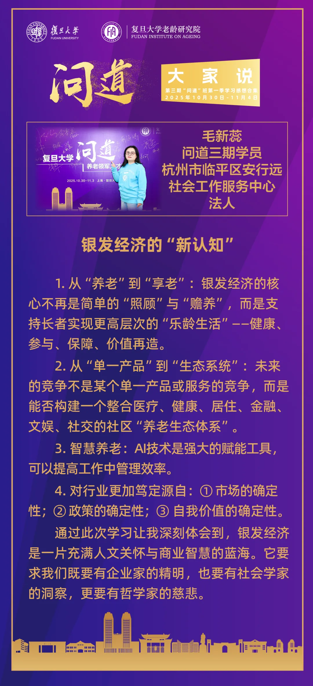 2025年,复旦大学老龄研究院成功举办了:第三期复旦大学“问道”养老领军人才研修班、第二期复旦大学“闻道”养老机构院长高级研修班等培训项目。“问道”、“闻道”品牌项目是从养老人才队伍建设角度对“积极应对人口老龄化”国家战略的实践应答,探索养老领域终身教育新模式。