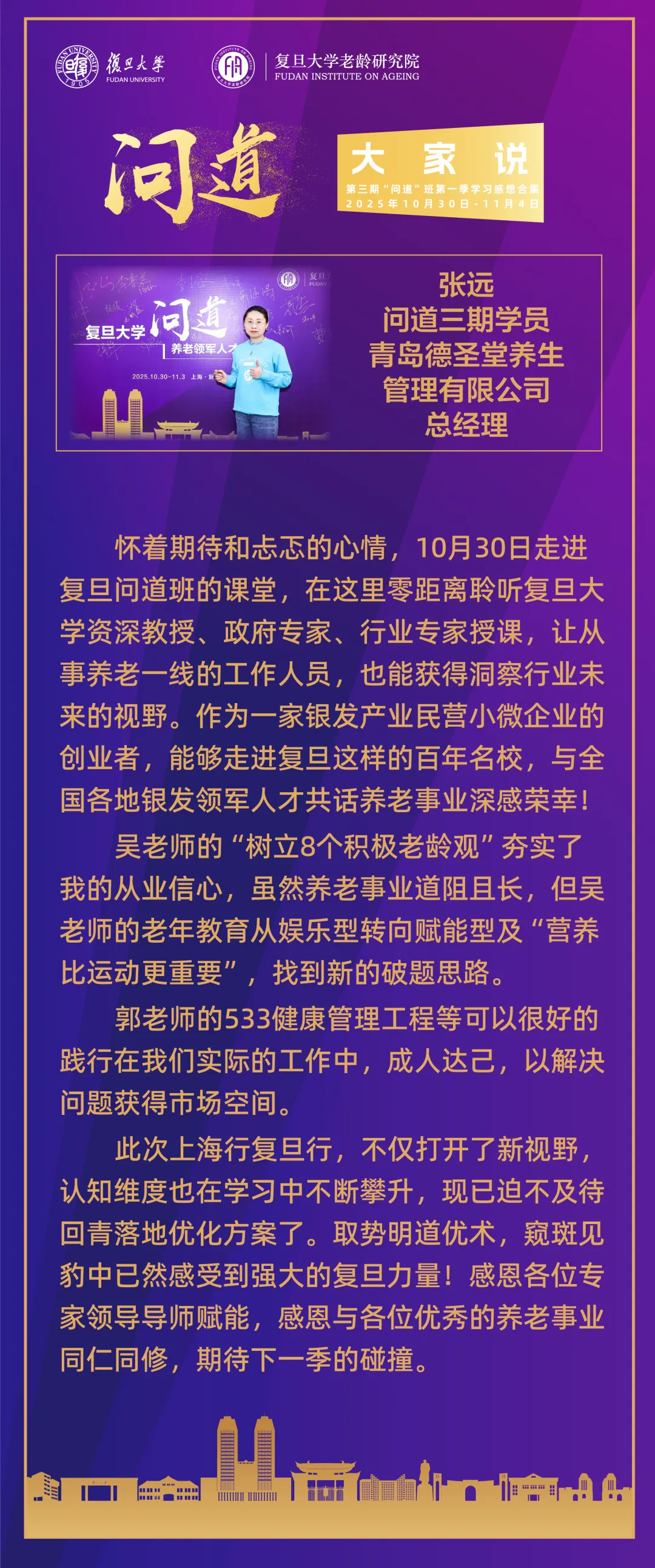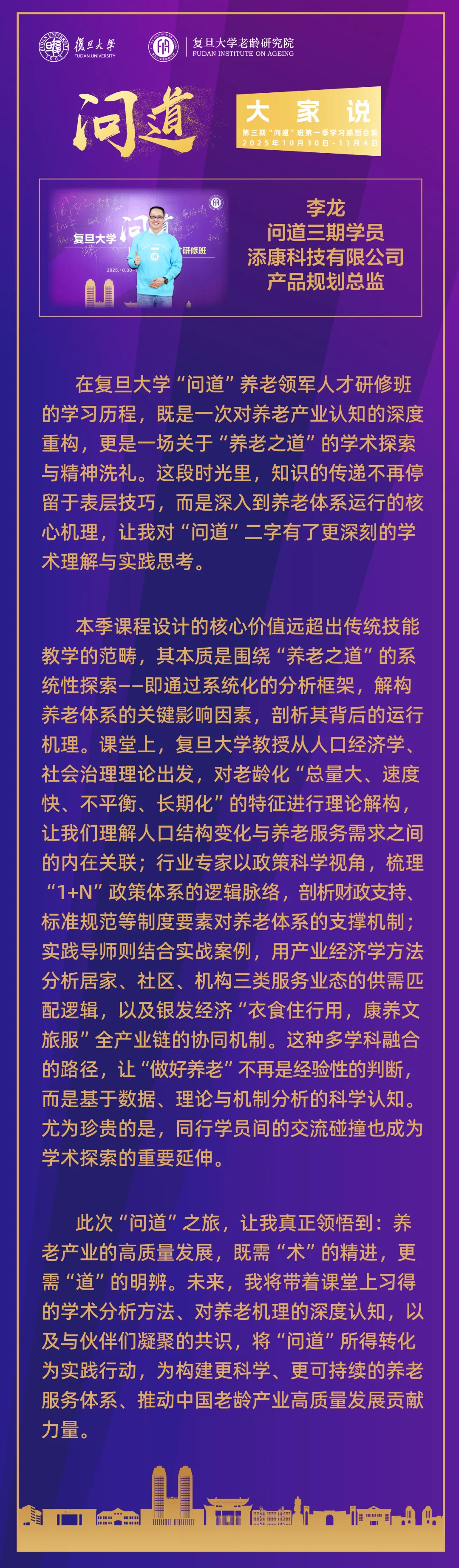 2025年,复旦大学老龄研究院成功举办了:第三期复旦大学“问道”养老领军人才研修班、第二期复旦大学“闻道”养老机构院长高级研修班等培训项目。“问道”、“闻道”品牌项目是从养老人才队伍建设角度对“积极应对人口老龄化”国家战略的实践应答,探索养老领域终身教育新模式。